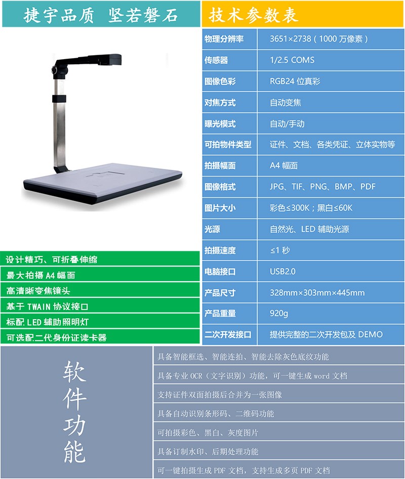 “捷易拍”品牌的高拍儀產品可以完全取代傳統(tǒng)平板掃描儀,除了在各項性能指標上優(yōu)于傳統(tǒng)掃描儀之外,更具備了體積小、無機械損耗、不用外接電源等傳統(tǒng)掃描儀無法實現的優(yōu)點!