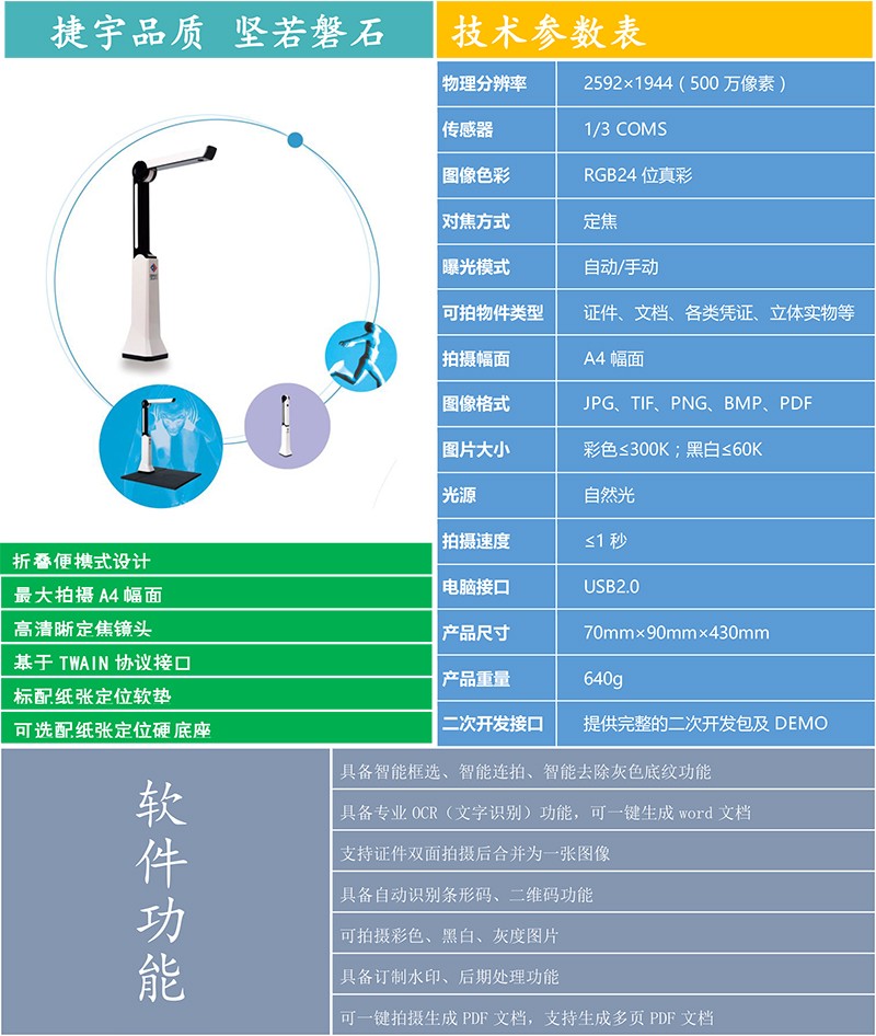 “捷易拍”品牌的高拍儀產品集成了高速文檔拍攝技術、OCR光學智能識別技術、自動目錄存儲技術等當今最熱門的技術,迅速、準確地將大量有價值的紙張信息數字化,并有效的存儲起來,加以配合各行業使用的影像管理系統,能大大推動辦公領域的文檔數字信息化進程。