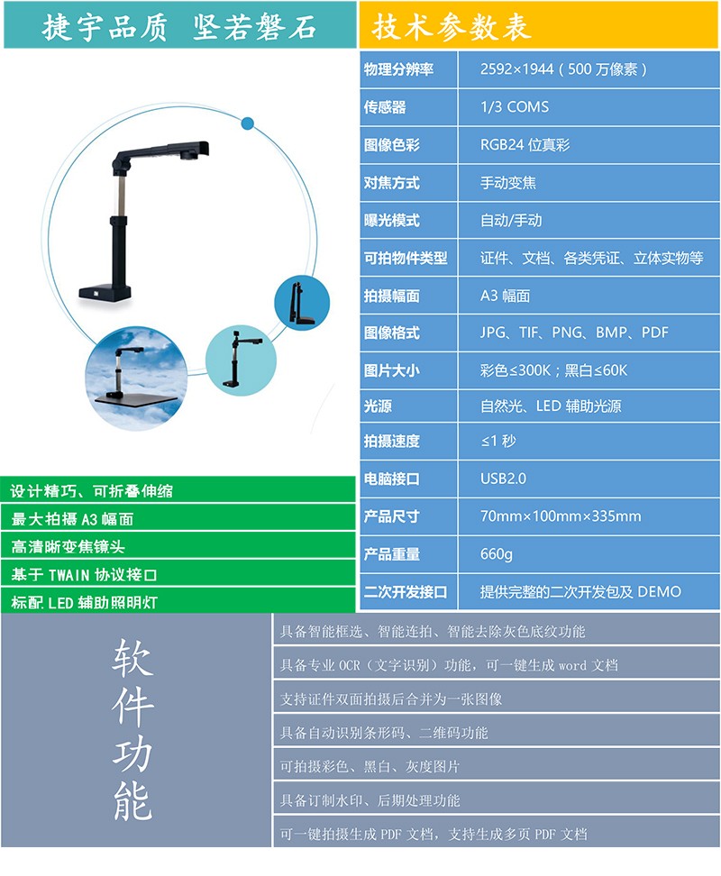 “捷宇”品牌的高拍儀產(chǎn)品可以完全取代傳統(tǒng)平板掃描儀,除了在各項(xiàng)性能指標(biāo)上優(yōu)于傳統(tǒng)掃描儀之外,更具備了體積小、無(wú)機(jī)械損耗、不用外接電源等傳統(tǒng)掃描儀無(wú)法實(shí)現(xiàn)的優(yōu)點(diǎn)!